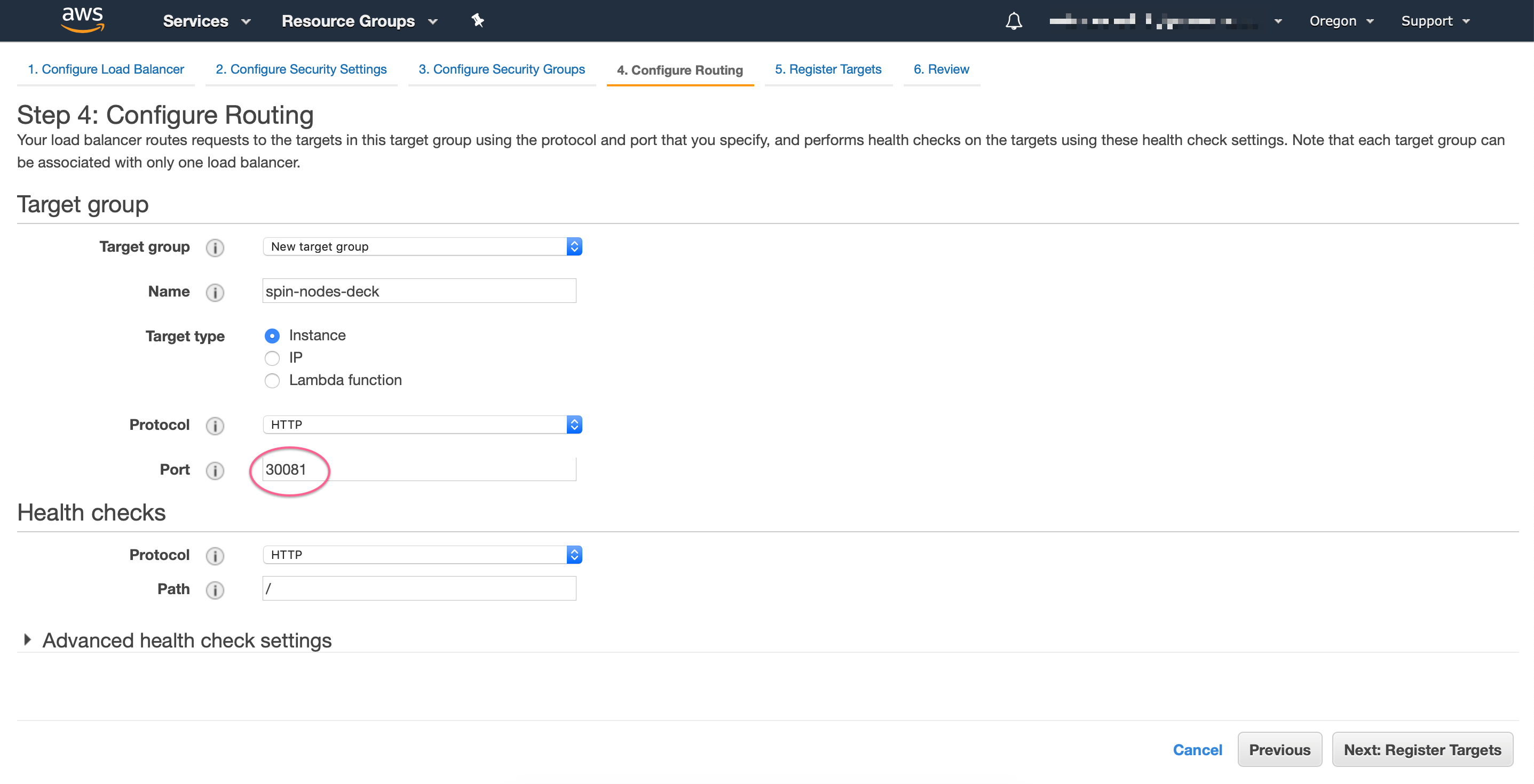 Now you want to create a new target group that points to DECK_PORT or GATE_PORT, taken from the NodePort created in the previous step:
