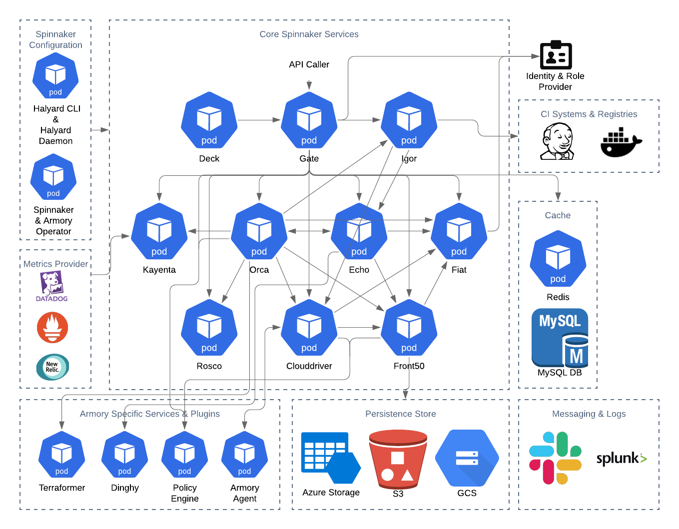 Armory Continuous Deployment is an enterprise version of open source Spinnaker. It is composed of several microservices for resiliency and follows the single-responsibility principle. It allows for faster iteration on each individual component and a more pluggable architecture for custom components. See the open source Spinnaker microservices overview for port mappings and a table of service interdependencies.