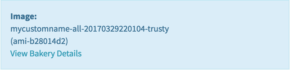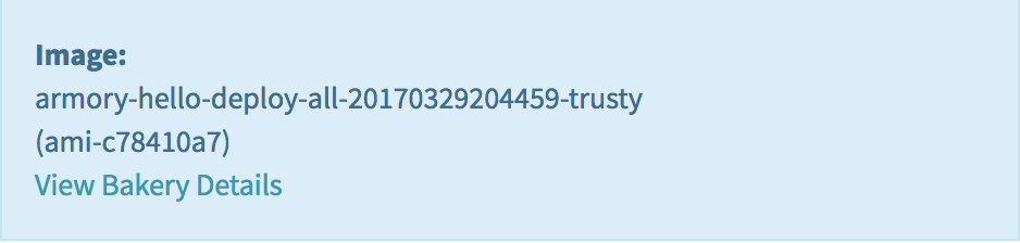 Notice that the AMI name and ID are shared in the lower right’s blue box - in this example it is “armory-hello-deploy-all-20170329204459-trusty (ami-c78410a7)”.