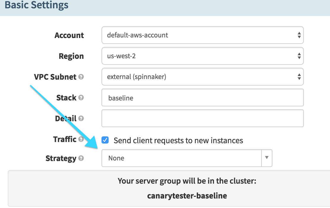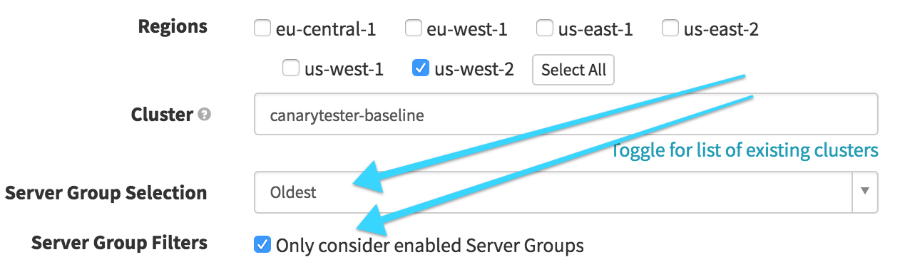 In this stage, we want to find our baseline, based on what’s currently in production. We select our production cluster and then look for the “Oldest” enabled Server Group. This will later be referenced to act as our baseline server group for the canary.