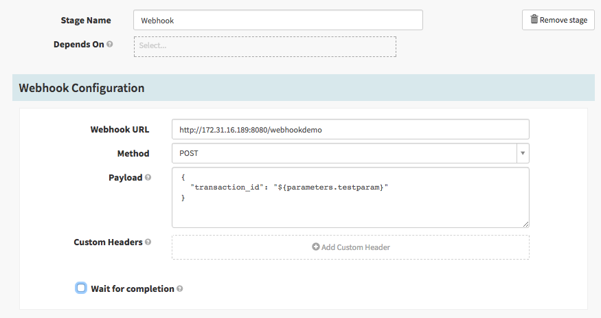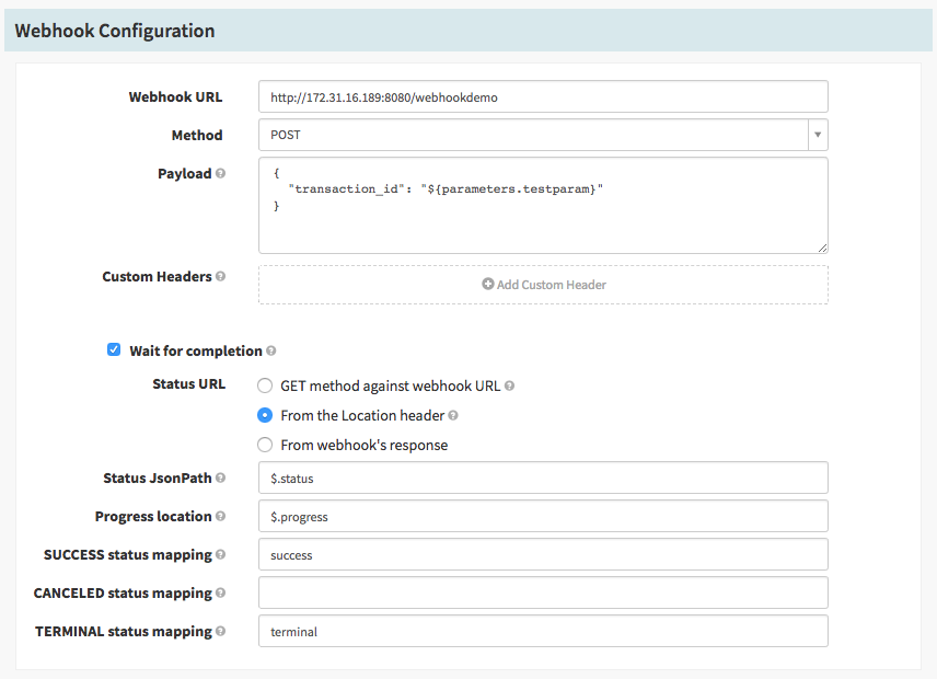 In this simple configuration the stage will be marked as successful if it gets a 2XX status code back, and will fail on anything else. If the return value from the request itself isn’t enough to determine the overall success you can check the “Wait for completion” checkbox and get a set of additional configuration: