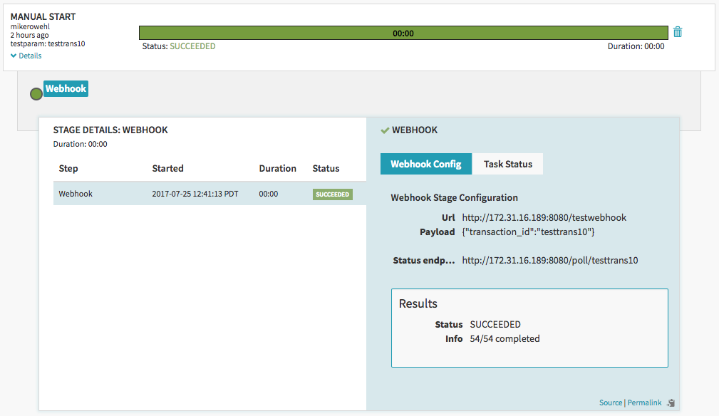 Spinnaker records the URL used as part of the webhook, the payload, and the status URL as part of the stage details. If the webhook transaction can run for a long time and there’s information available from the API, you can set the “Progress location” expression to also extract info to give some feedback about status in the Spinnaker UI. The “Progress location” value shows up in the Info field of the stage details: