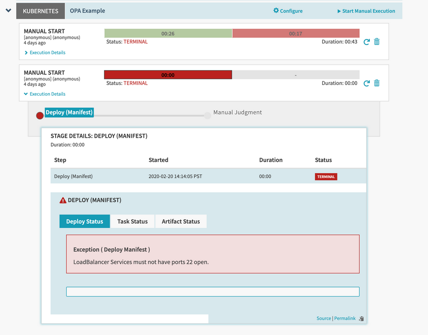 Deployment validation works by mapping an OPA policy package to a Spinnaker deployment task. For example, deploying a Kubernetes Service is done using the Deploy (Manifest) stage, so we’ll write a policy that applies to that task.